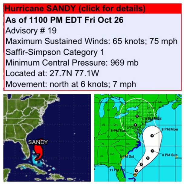 11PM update on #Sandy: no change in wind speed or forward speed, slight DROP in pressure. #track and locatio